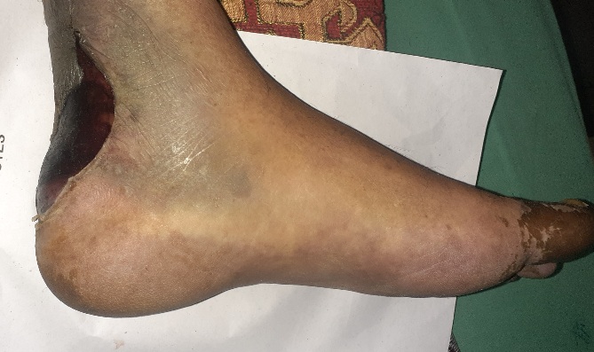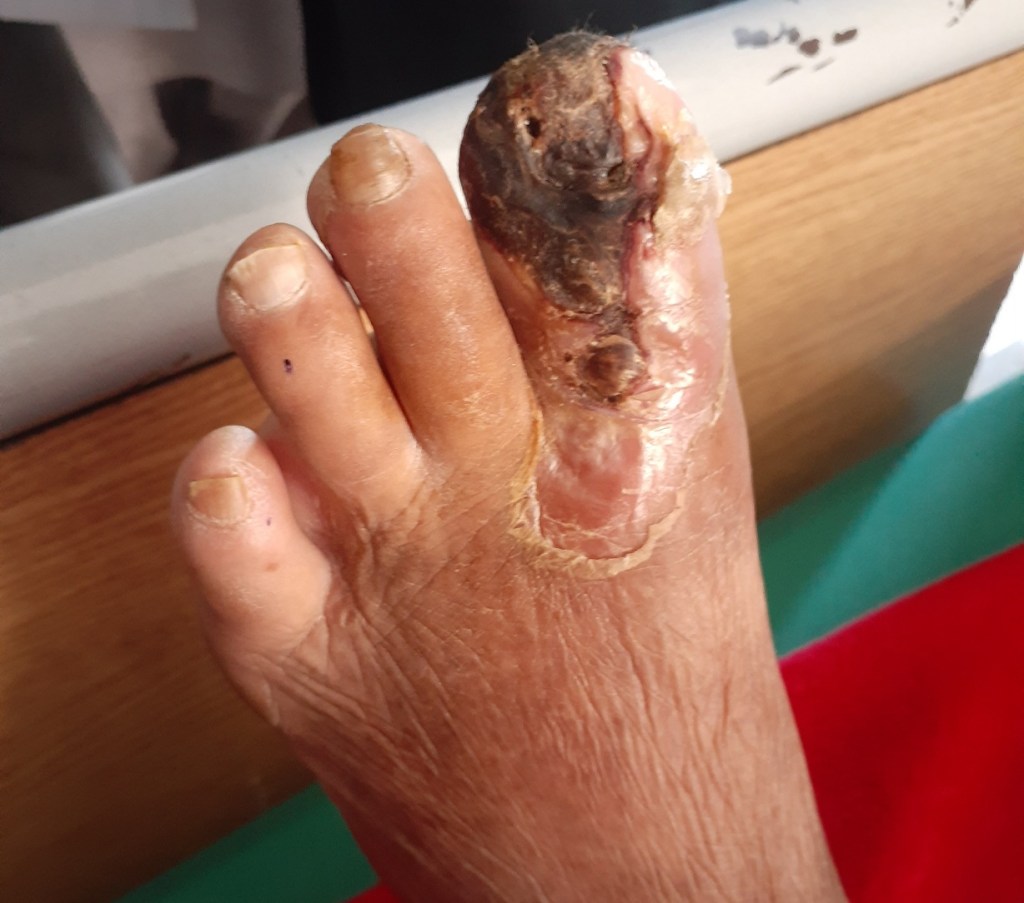 Most of diabetic patients have lipid abnormalities causing fats deposition in blood vessels leading to narrowing of vessels(diabetic angiopathy). This will lead to dcreased blood flow due to peripheral arterial disease. The feet will initially become cold and later discoloration (gangrene) will develop due to necrosis of tissue, this will eventually lead to amputations.