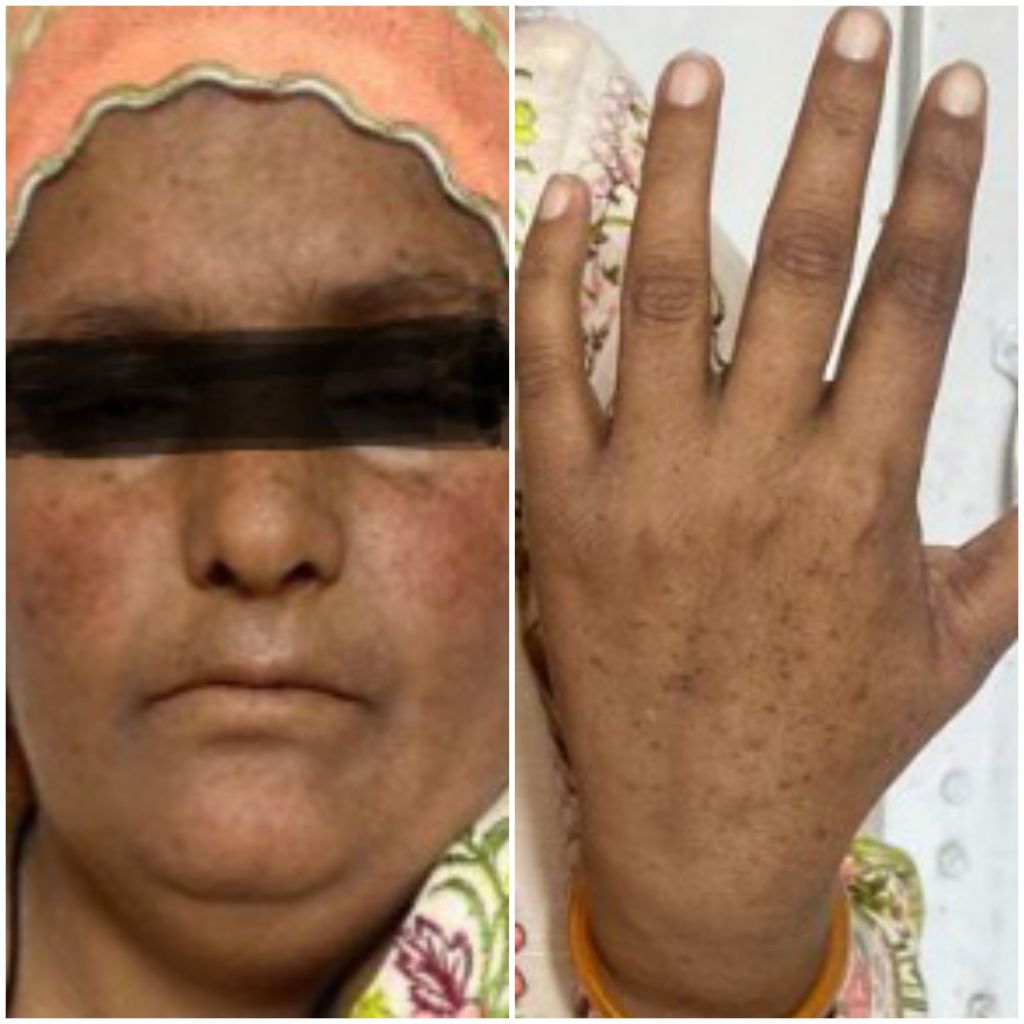 She is a young short stature female with pallor, jaudice, small palpebral fissures, stabismus, microcephaly and pigmentation on face and hands, She has deformed right thumb and absent left clavicle with deformed left shoulder (dysostosis), She is pale and having tinge of jaundice.