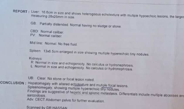 Her fresh record and ultrasound done a month ago showed enlarged liver and spleen and hypoechoic areas in liver suggesting metastatic disease.