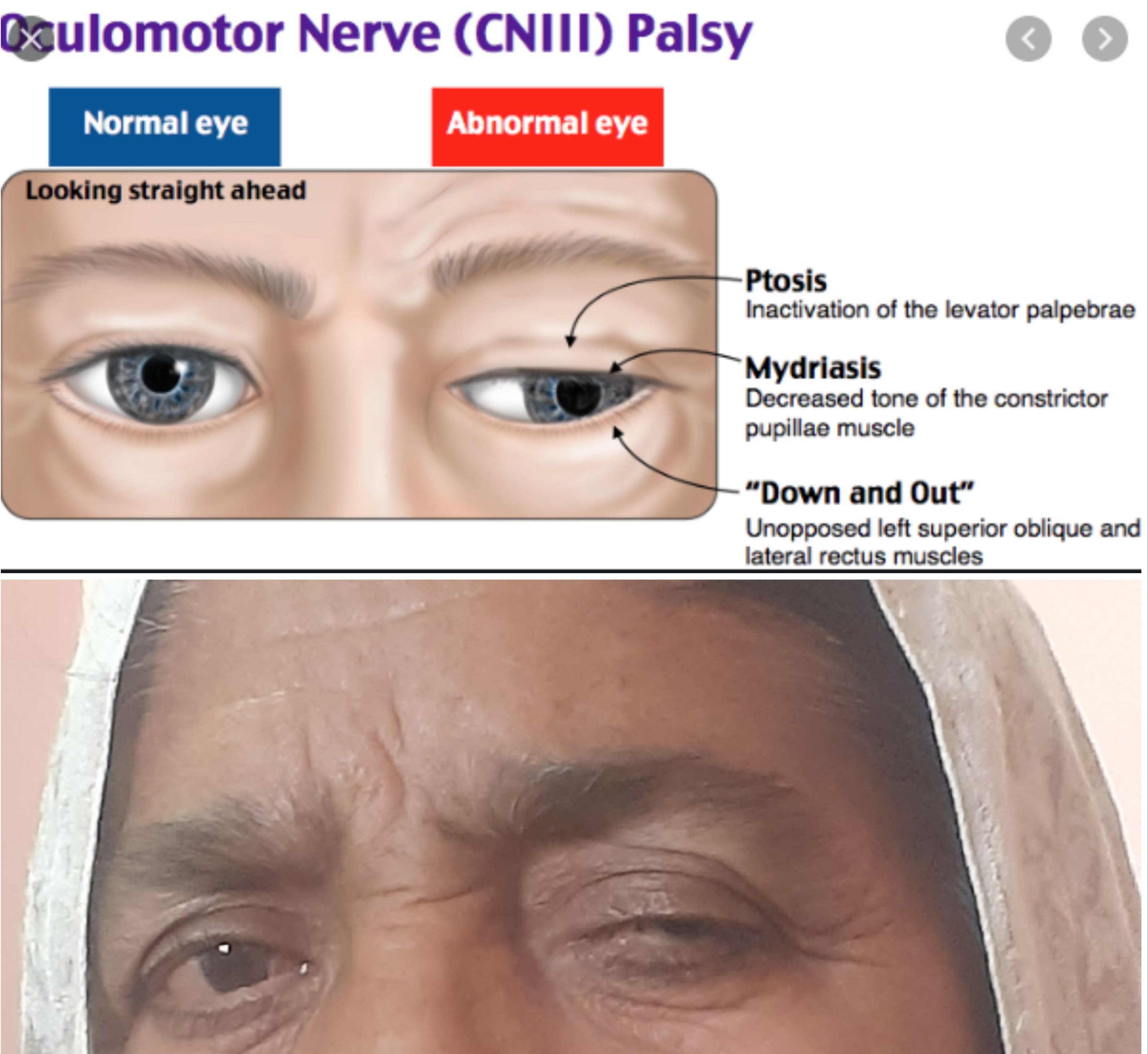 Occulomotor (third cranial) nerve palsy is one of common complications of Diabetes. The patient with long history of diabetes are at risk of getting the paralysis of third nerve.